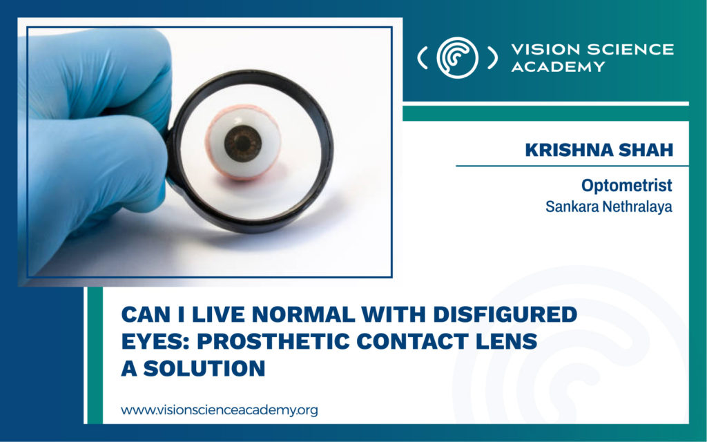 Besides providing better cosmetic than evisceration or enucleation, prosthetic contact lenses significantly improve the social relationships and well-being of patients. Prosthetic contact lens plays an important role in maintaining the integrity of orbital anatomy in case of disfigured or an absolute (blind) eye. Thus, prosthetic contact lens aid in enhancing cosmetic appearance and accelerating rehabilitation of people with disfigured blind eyes.