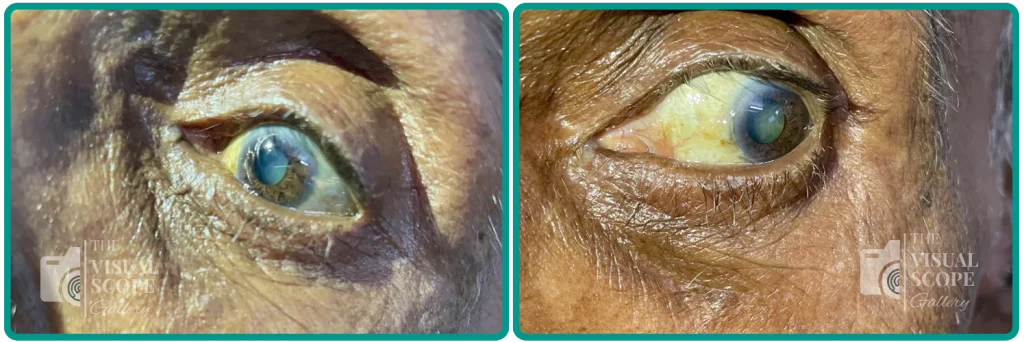 This image depicts an eye affected by both cataract and pterygium. The cloudy lens indicates cataract formation, leading to progressive vision loss. Additionally, a fleshy, wedge-shaped pterygium extends from the conjunctiva onto the cornea, which may cause irritation, astigmatism, or visual obstruction. Both conditions are commonly associated with aging, UV exposure, and environmental factors.