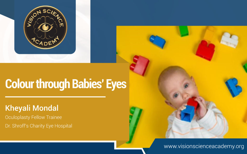When an infant’s eyes absorb a world of new vision, colours are reused purely, in a pre-verbal region of the brain. As we grow-up, colours are recovered in the brain’s language centre part, refracted by the notions we’ve for them. Studies suggest that, with babies being trichromatic (both active cone red-green & blue-yellow opponents) they develop the red-green colour medium first, and blue-yellow medium develops 4 to 8 weeks later by 3 months.(1,5)