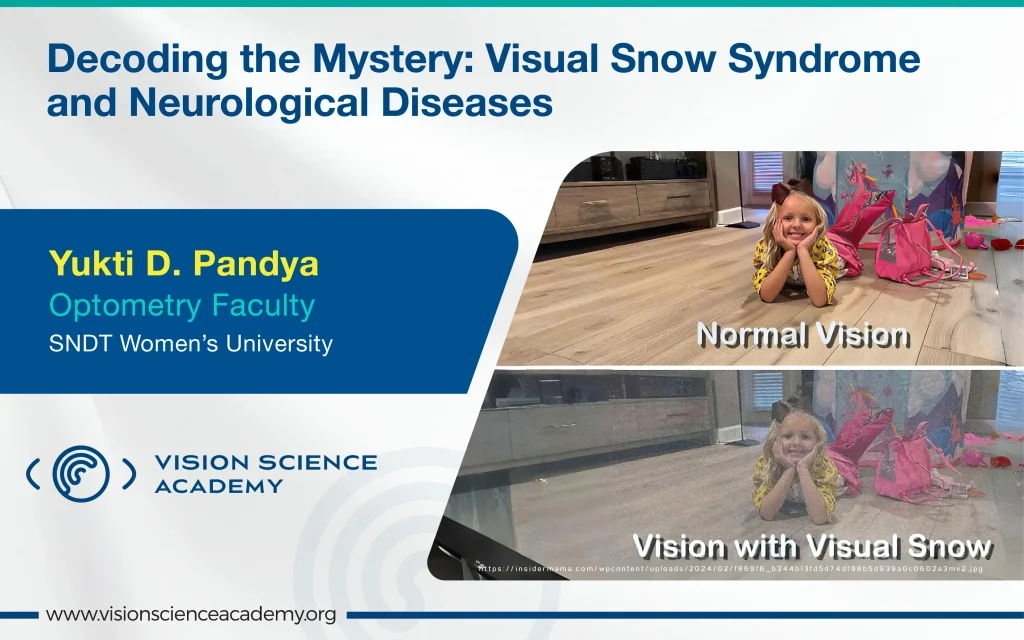 Visual Snow Syndrome (VSS), identified in 1995, is characterised by persistent flickering or pixelation across the visual field, significantly impacting daily activities. It commonly begins in young adulthood but may occur at any age. VSS is defined by continuous “visual snow” along with at least two additional visual symptoms. Although typically benign and non-progressive, it may be associated with ocular or neurological disorders. (1)