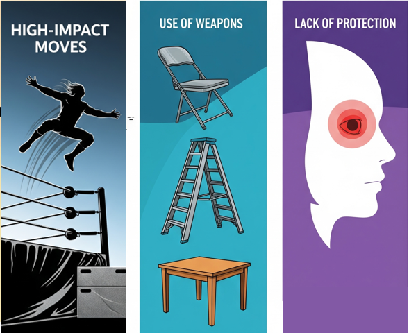 The risk of ocular injury in professional wrestling is influenced by multiple factors, including high-impact strikes, aerial manoeuvres, and collisions. The frequent use of foreign objects—such as chairs, ladders, tables, trash cans, thumbtacks, and other weapons—further increases the likelihood of eye trauma. Additionally, the lack of protective eyewear during performances places wrestlers at greater risk. (7)