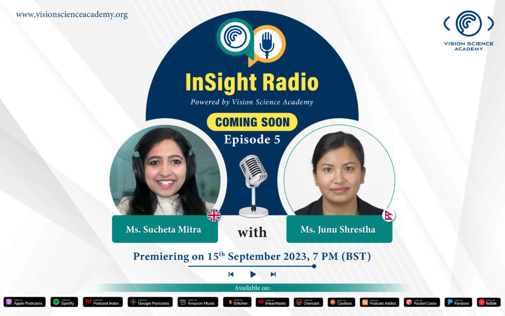 Join us on InSight Radio for an inspiring episode featuring Ms. Junu Shrestha, a Chevening scholar. Discover her incredible journey from optometry in Nepal to pursuing a master’s in public health and health policy planning in the UK. She uncovered the scholarship opportunity, leading her to prestigious institutions like London School of Hygiene and Tropical Medicine and London School of Economics and Political Sciences. Junu’s story emphasises the importance of addressing broader societal concerns in healthcare. Gain insights into cost-effective interventions for conditions like cataract, glaucoma, and diabetic retinopathy, and explore the strategic plan, “Insight 2030,” aiming to eliminate avoidable blindness and vision impairment globally.
