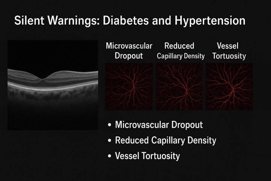 Both Diabetes and Hypertension are notorious for causing retinal damage, but often too late by the time it becomes clinically visible. OCTA helps uncover early warning signs: