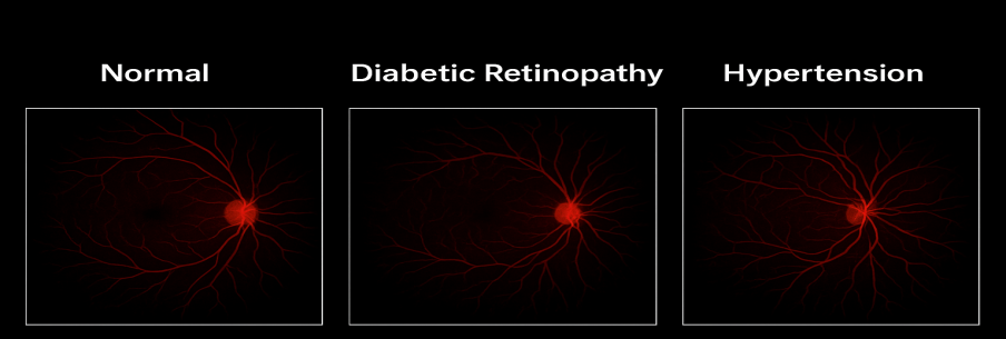 Figure 2: OCTA Showing Reduced Vessel Density in Diabetic Retinopathy and Hypertension compared to Healthy Eye