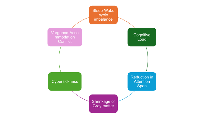 Extended exposure to digital screens, particularly those displaying motion-rich content, can lead to a phenomenon known as cybersickness. This condition manifests with symptoms akin to motion sickness, such as dizziness, nausea, and disorientation. The underlying cause is primarily attributed to a sensory conflict between the visual and vestibular systems. When engaging with dynamic screen content, there is a visual-vestibular mismatch. This mismatch can create a false sensation of self-motion, known as vection, where individuals feel as though they are moving despite being stationary. (7,8)