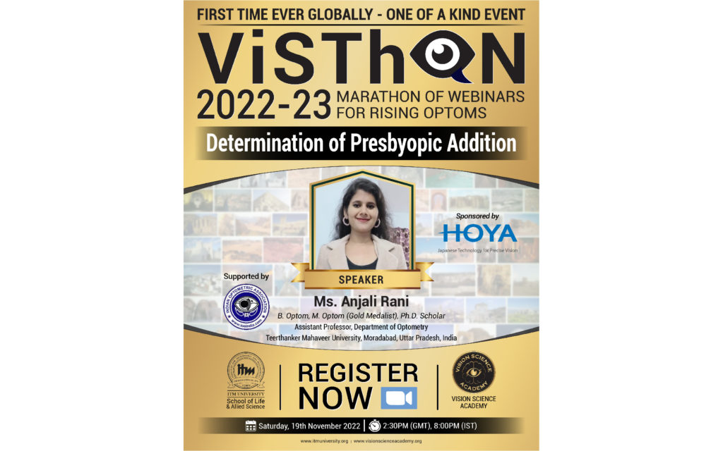 In this webinar, Ms. Anjali Rani will discuss presbyopia and how to determine presbyopic addition in different forms of spectacle lense.