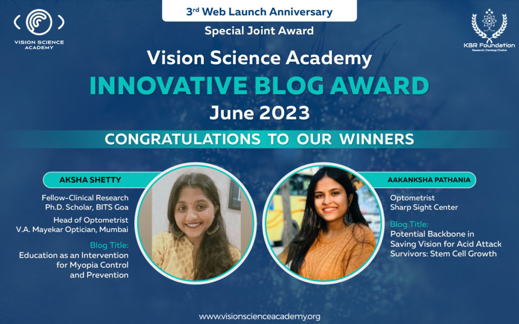 Join us in celebrating the remarkable achievements of Aakanksha Pathania and Aksha Shetty as they receive the VSA – KBRF Award for June 2023. Their valuable contributions will undoubtedly inspire and drive positive change among the Vision Science community.
